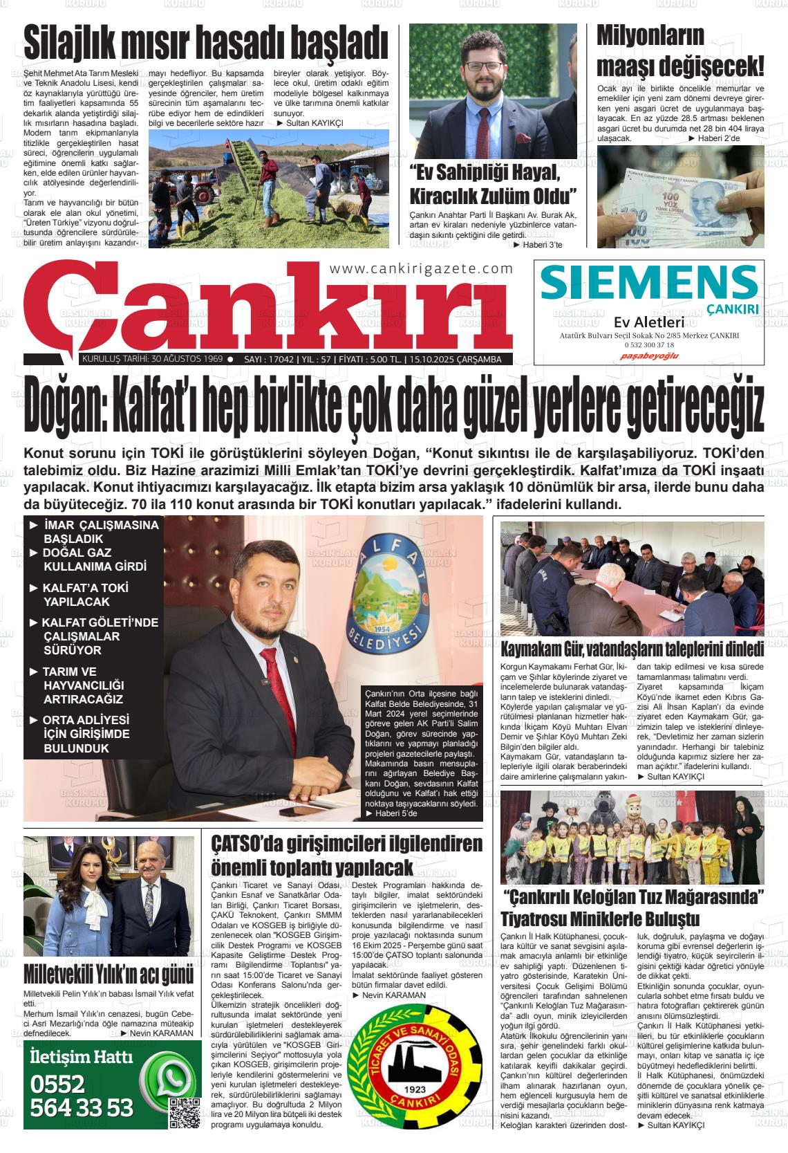 Çankırı Yerel Gazeteleri 15 Ekim 2025, Çarşamba Günü Manşeti