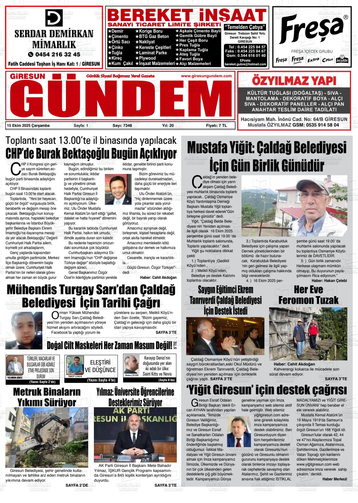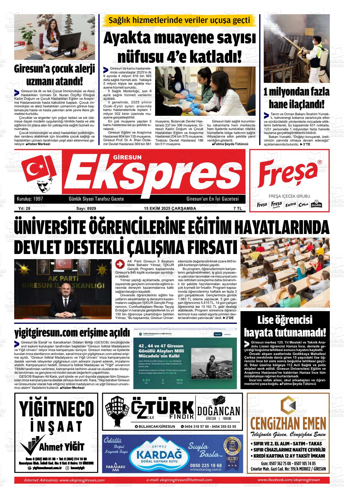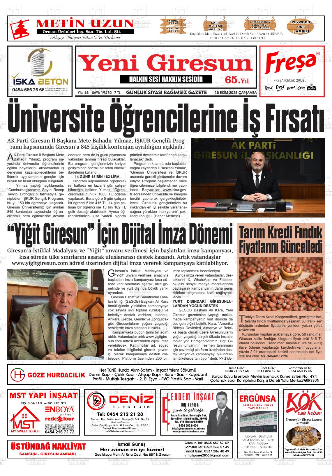 Gİresun Yerel Gazeteleri 01 Aralık 2025, Pazartesi Günü Manşeti