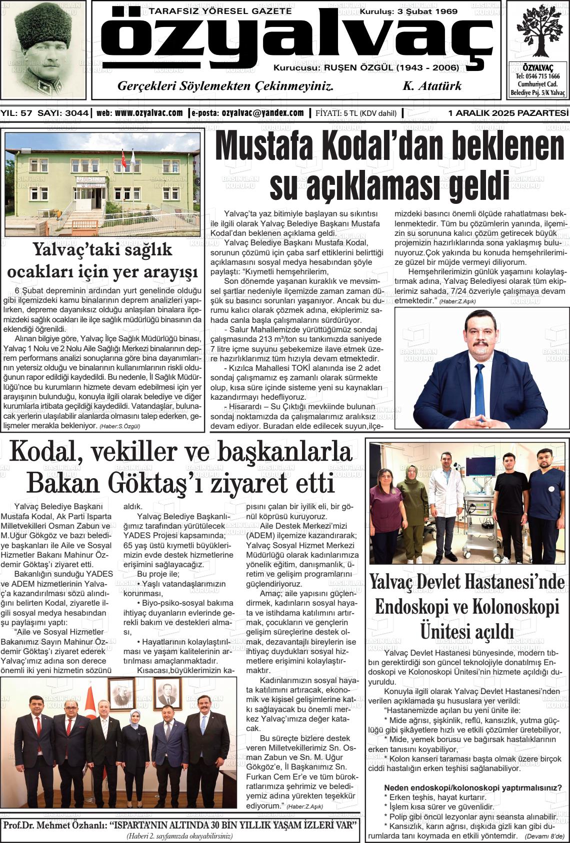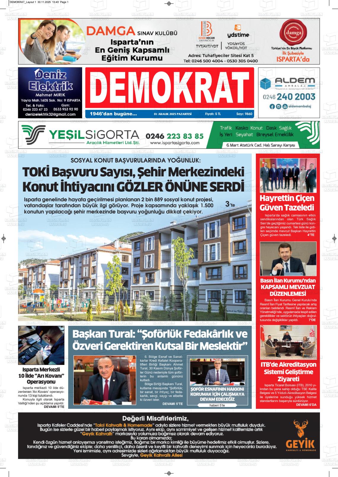 Isparta Yerel Gazeteleri 01 Aralık 2025, Pazartesi Günü Manşeti